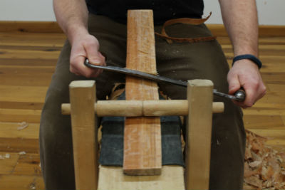 The drawknife'due south partner is the shave horse. You want to get i. Or at least borrow one – my approximate is that you'll never get back to using a workbench or modified setup once yous spend a niggling fourth dimension using 1. You'll find them on Craigslist or yous tin rapidly brand 1. The shave horse puts the piece of work piece right above your lap and makes adjustment easy. I'm always excited when a project puts me at the shave equus caballus.