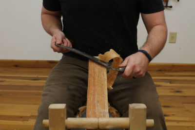 Wet woods (wood from a freshly cut tree or log) is easier to shave, though you tin piece through harder wood. Outset bespeak of advice when shaving – take small-scale shavings until y'all are comfy with the tool. You lot should be able to accept a long, controlled, shine pull with the tool – non a curt or halting cutting. There'south a rhythm to it. You'll proceed your elbows close to your sides and rock your trunk back slightly equally you work (It'southward not nearly as exaggerated as this, only imagine rowing an oar – information technology's non all arm work!). Making the cutting should feel pretty easy, done without much try. If you detect it hard to pull the tool and then you are probably trying to take likewise much material. Endeavor a lighter shaving. You're pulling the precipitous blade towards your body – always brand sure you're under control. Taking smaller shavings helps with this.